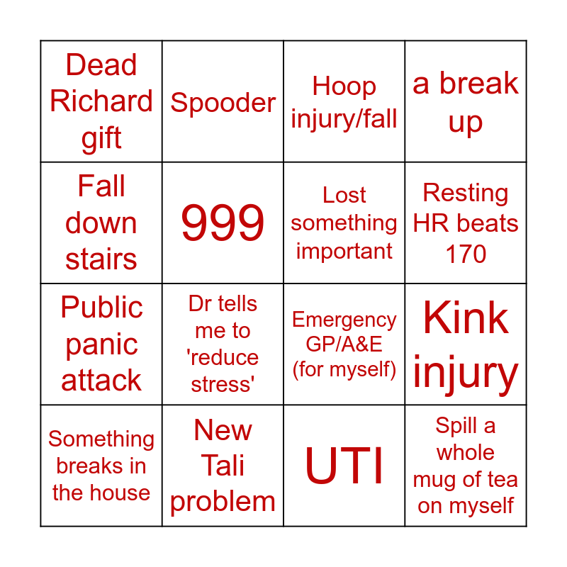 This bingo card has 16 words: New Tali problem, Kink injury, Hoop injury/fall, Dead Richard gift, Public panic attack, Spooder, Emergency GP/A&E (for myself), UTI, Fall down stairs, 999, Something breaks in the house, a break up, Dr tells me to 'reduce stress', Resting HR beats 170, Lost something important and Spill a whole mug of tea on myself.