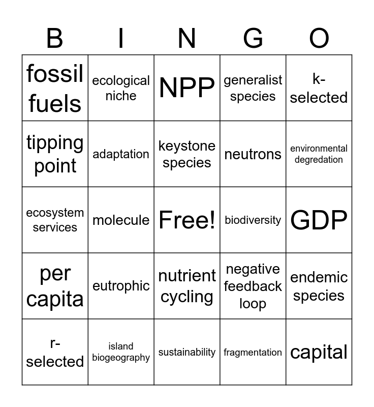 This bingo card has a free space and 25 words: eutrophic, sustainability, keystone species, r-selected, k-selected, fossil fuels, tipping point, ecological niche, biodiversity, nutrient cycling, neutrons, ecosystem services, negative feedback loop, endemic species, adaptation, specialist species, GDP, NPP, environmental degredation, molecule, capital, island biogeography, per capita, generalist species and fragmentation.