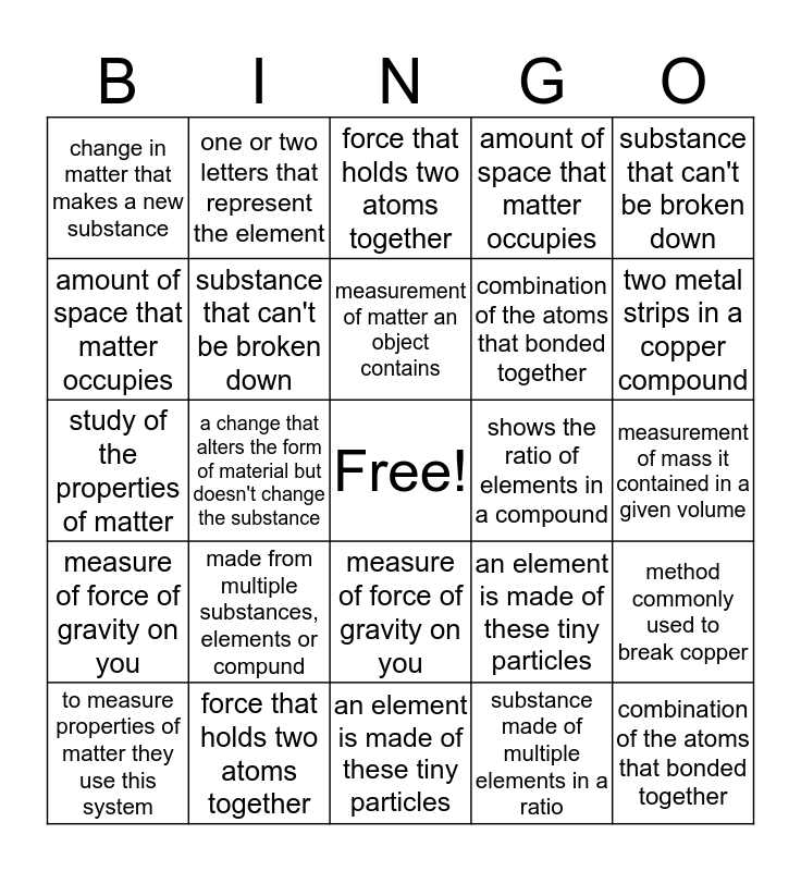 This bingo card has a free space and 24 words: made from multiple substances, elements or compund, force that holds two atoms together, measurement of matter an object contains, to measure properties of matter they use this system, substance that can't be broken down, change in matter that makes a new substance, amount of space that matter occupies, one or two letters that represent the element, shows the ratio of elements in a compound, measure of force of gravity on you, combination of the atoms that bonded together, study of the properties of matter, an element is made of these tiny particles, method commonly used to break copper, substance that can't be broken down, substance made of multiple elements in a ratio, measurement of mass it contained in a given volume, force that holds two atoms together, two metal strips in a copper compound, a change that alters the form of material but doesn't change the substance, combination of the atoms that bonded together, measure of force of gravity on you, amount of space that matter occupies and an element is made of these tiny particles.