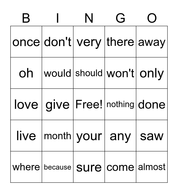 This bingo card has a free space and 27 words: any, many, won't, sure, oh, very, don't, live, nothing, saw, love, there, where, because, only, off, would, should, month, once, done, come, give, almost, your, away and one.