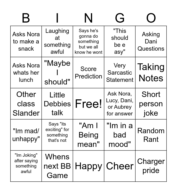 This bingo card has a free space and 26 words: "Am I Being mean", Cheer, Score Prediction, Whens next BB Game, Asking Dani Questions, Asks Nora to make a snack, Asks Nora whats her lunch, Laughing at something awful, Short person joke, "Im in a bad mood", Very Sarcastic Statement, Other class Slander, Random Rant, "Im Joking" after saying something awful, Little Debbies talk, Says something he should do, "This should be easy", "Im mad/ unhappy", Says he's gonna do something but we all know he wont, Charger pride, Taking Notes, Happy, Ask Nora, Lucy, Dani, or Aubrey for answer, Says "its exciting" for something that's not, "Maybe I should" and "Go Chargers".