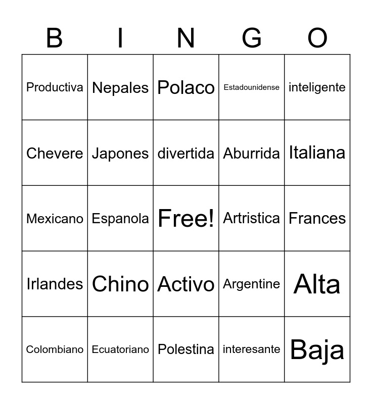 This bingo card has a free space and 24 words: Chino, Ecuatoriano, divertida, Colombiano, inteligente, Productiva, Chevere, Nepales, Artristica, Activo, Aburrida, Mexicano, Argentine, Alta, Japones, interesante, Frances, Polaco, Italiana, Espanola, Baja, Irlandes, Estadounidense and Polestina.
