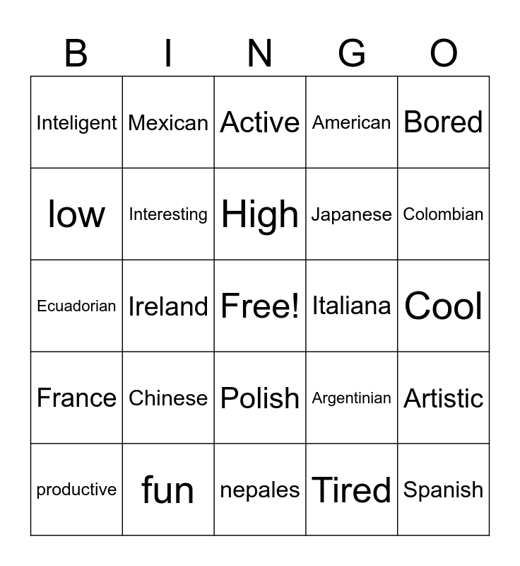 This bingo card has a free space and 24 words: Chinese, fun, High, productive, Bored, Inteligent, low, Mexican, Italiana, Polish, Japanese, Ecuadorian, Argentinian, Artistic, Interesting, Tired, Cool, Active, Colombian, Ireland, Spanish, France, American and nepales.