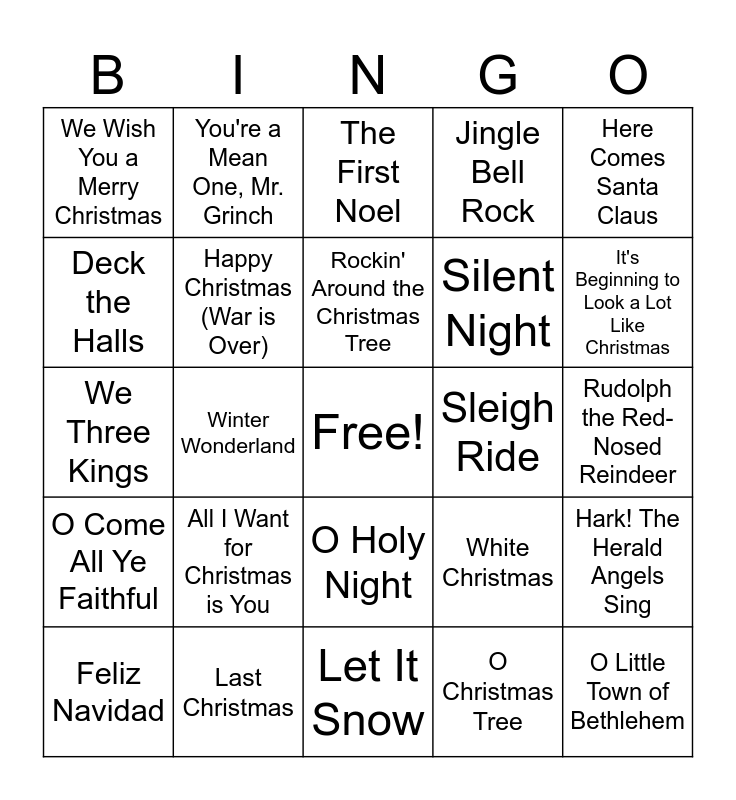 This bingo card has a free space and 25 words: All I Want for Christmas is You, Let It Snow, Rockin' Around the Christmas Tree, Feliz Navidad, Here Comes Santa Claus, We Wish You a Merry Christmas, Deck the Halls, You're a Mean One, Mr. Grinch, Sleigh Ride, O Holy Night, Silent Night, We Three Kings, White Christmas, Hark! The Herald Angels Sing, Happy Christmas (War is Over), Carol of the Bells, Rudolph the Red-Nosed Reindeer, The First Noel, It's Beginning to Look a Lot Like Christmas, Winter Wonderland, O Little Town of Bethlehem, Last Christmas, O Come All Ye Faithful, Jingle Bell Rock and O Christmas Tree.