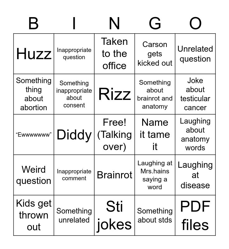This bingo card has a free space and 24 words: Inappropriate comment, Something unrelated, Rizz, Kids get thrown out, Unrelated question, Huzz, Something thing about abortion, Inappropriate question, Name it tame it, Brainrot, Something about brainrot and anatomy, “Ewwwwwww”, Laughing at Mrs.hains saying a word, Laughing at disease, Something inappropriate about consent, Something about stds, Laughing about anatomy words, Taken to the office, Joke about testicular cancer, Diddy, PDF files, Weird question, Carson gets kicked out and Sti jokes.