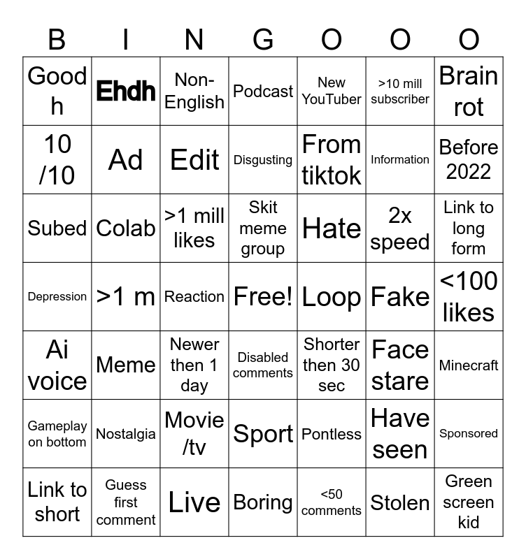 This bingo card has a free space and 48 words: Pontless, Information, Boring, >1 m, >1 mill likes, <100 likes, Ehdh, Guess first comment, >10 mill subscriber, Disabled comments, Brain rot, Podcast, 2x speed, Hate, Gameplay on bottom, Fake, 10 /10, Before 2022, Have seen, New YouTuber, From tiktok, Reaction, Good h, Ad, Sponsored, Edit, Link to long form, Link to short, Skit meme group, Colab, Stolen, Loop, Minecraft, Nostalgia, Depression, Shorter then 30 sec, Face stare, Subed, Newer then 1 day, Movie /tv, Ai voice, Green screen kid, Non-English, Live, Disgusting, Sport, Meme and <50 comments.