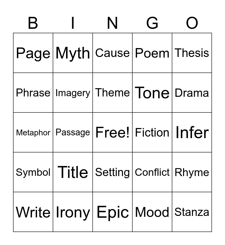 This bingo card has a free space and 40 words: Simile, Metaphor, Allusion, Imagery, Irony, Setting, Theme, Plot, Thesis, Symbol, Passage, Poem, Stanza, Infer, Fiction, Title, Author, Page, Claim, Cause, Rhyme, Mood, Tone, Phrase, Adverb, Verb, Noun, Question, Scene, Act, Play, Write, Character, Conflict, Drama, Epic, Essay, Idiom, Myth and Novel.