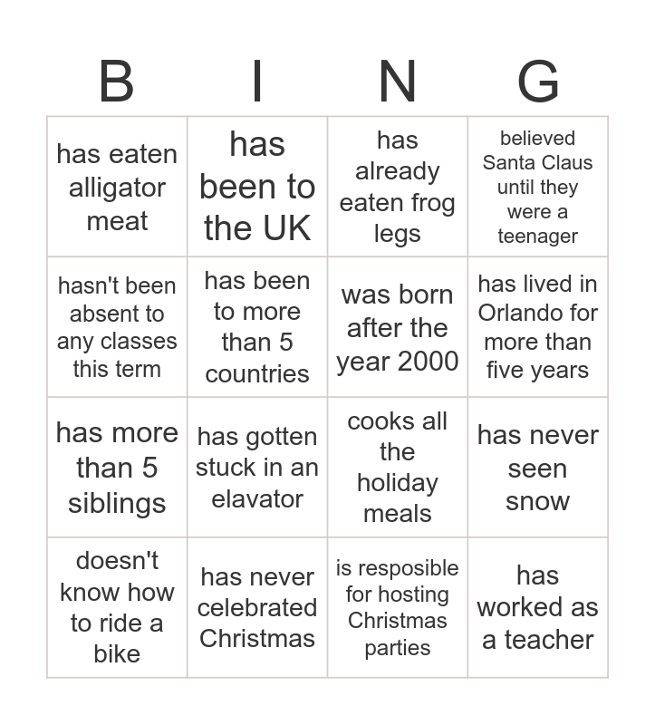 This bingo card has 16 words: has never celebrated Christmas, has never seen snow, has already eaten frog legs, has eaten alligator meat, has more than 5 siblings, has been to the UK, cooks all the holiday meals, is resposible for hosting Christmas parties, hasn't been absent to any classes this term, has been to more than 5 countries, doesn't know how to ride a bike, believed Santa Claus until they were a teenager, has gotten stuck in an elavator, has lived in Orlando for more than five years, was born after the year 2000 and has worked as a teacher.