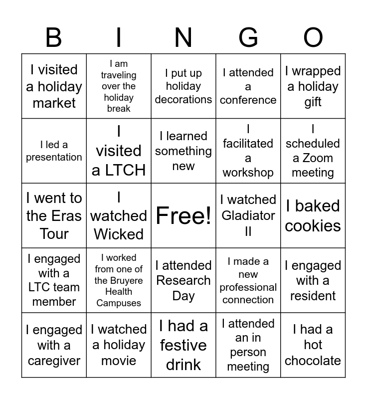 This bingo card has a free space and 24 words: I worked from one of the Bruyere Health Campuses, I watched a holiday movie, I learned something new, I engaged with a caregiver, I wrapped a holiday gift, I visited a holiday market, I led a presentation, I am traveling over the holiday break, I watched Gladiator II, I attended Research Day, I facilitated a workshop, I went to the Eras Tour, I made a new professional connection, I engaged with a resident, I visited a LTCH, I attended an in person meeting, I baked cookies, I put up holiday decorations, I scheduled a Zoom meeting, I watched Wicked, I had a hot chocolate, I engaged with a LTC team member, I attended a conference and I had a festive drink.