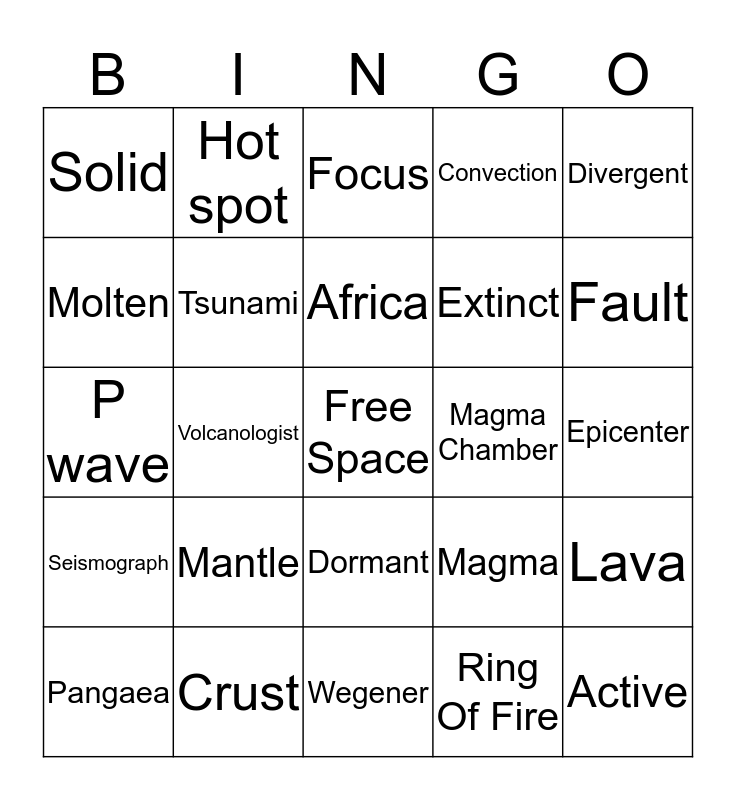 This bingo card has a free space and 24 words: Mantle, Crust, Africa, Pangaea, Divergent, Solid, Molten, Hot spot, Magma Chamber, Dormant, Extinct, P wave, Magma, Lava, Tsunami, Ring Of Fire, Epicenter, Focus, Fault, Volcanologist, Active, Seismograph, Convection and Wegener.