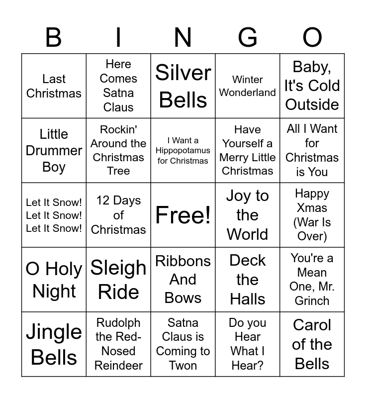 This bingo card has a free space and 35 words: Underneath the Tree, Santa, Tell Me, Jingle Bell Rock, Rockin' Around the Christmas Tree, Ribbons And Bows, Winter Wonderland, Little Drummer Boy, Merry Christmas, Happy Holidays, I Want a Hippopotamus for Christmas, Run, Rudolph, Run, Let It Snow! Let It Snow! Let It Snow!, Baby, It's Cold Outside, It's Beginning to Look a lot Like Christmas, Little Saint Nick, Last Christmas, Joy to the World, Do you Hear What I Hear?, 12 Days of Christmas, O Holy Night, Carol of the Bells, Deck the Halls, Jingle Bells, You're a Mean One, Mr. Grinch, Rudolph the Red-Nosed Reindeer, Silver Bells, All I Want for Christmas is You, Holly Jolly Christmas, Feliz Navidad, Have Yourself a Merry Little Christmas, Happy Xmas (War Is Over), Blue Christmas, Satna Claus is Coming to Twon, Sleigh Ride, Here Comes Satna Claus and Mele Kalikimaka (Merry Christmas).