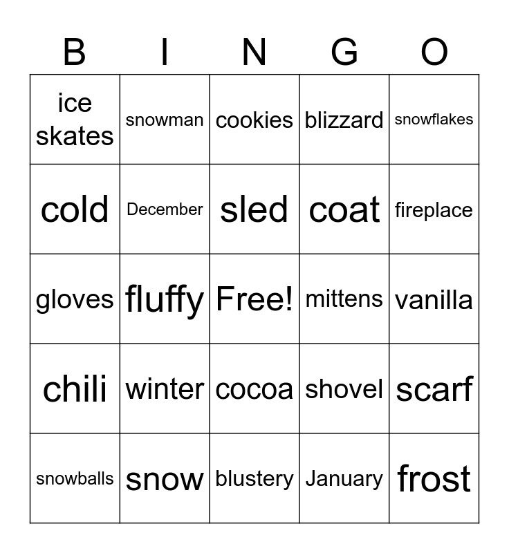 This bingo card has a free space and 24 words: winter, snow, sled, snowballs, snowflakes, ice skates, cold, snowman, mittens, cocoa, coat, gloves, shovel, scarf, December, January, vanilla, cookies, fireplace, fluffy, frost, chili, blizzard and blustery.