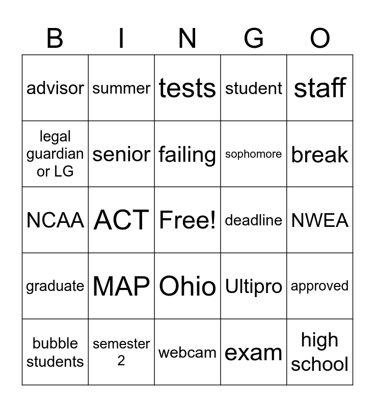 This bingo card has a free space and 59 words: semester 1, semester 2, graduation, graduate, exam, grades, senior, junior, sophomore, freshman, student, learning coach or LC, legal guardian or LG, teacher, counselor, advisor, high school, staff, passing, failing, deadline, tests, bubble students, approved, bonus, holiday, paycheck, internet, break, pilot, benchmark, results, spring, winter, summer, fall, ODEW, ACT, OHVA, NCAA, ELA, MAP, NWEA, BOY, MOY, EOY, remote testing, state assessments, Ohio, webcam, cambium, laptops, Engageli, Newrow, Zoom, Ultipro, January, February and Dr. Stewart.