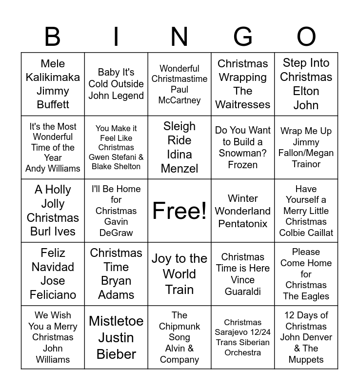 This bingo card has a free space and 24 words: Christmas Time Bryan Adams, Mistletoe Justin Bieber, Sleigh Ride Idina Menzel, We Wish You a Merry Christmas John Williams, Step Into Christmas Elton John, Mele Kalikimaka Jimmy Buffett, It's the Most Wonderful Time of the Year Andy Williams, Baby It's Cold Outside John Legend, Winter Wonderland Pentatonix, Joy to the World Train, Do You Want to Build a Snowman? Frozen, A Holly Jolly Christmas Burl Ives, Christmas Time is Here Vince Guaraldi, Please Come Home for Christmas The Eagles, You Make it Feel Like Christmas Gwen Stefani & Blake Shelton, Christmas Sarajevo 12/24 Trans Siberian Orchestra, Have Yourself a Merry Little Christmas Colbie Caillat, Wonderful Christmastime Paul McCartney, Wrap Me Up Jimmy Fallon/Megan Trainor, I'll Be Home for Christmas Gavin DeGraw, 12 Days of Christmas John Denver & The Muppets, Feliz Navidad Jose Feliciano, Christmas Wrapping The Waitresses and The Chipmunk Song Alvin & Company.