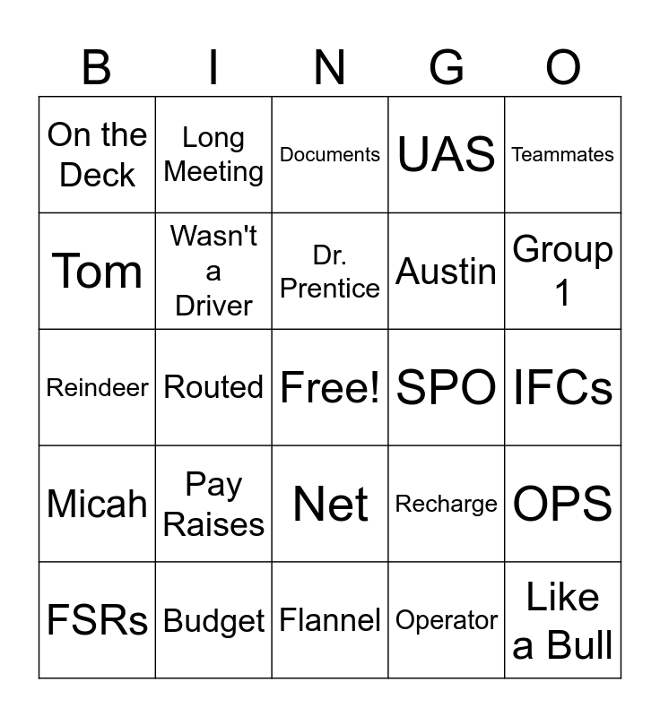 This bingo card has a free space and 77 words: Doug, Candy, Documents, Teams, Cam, NAVAIR, Cyndee, IPTs, Vacations, Keith, Puma, Team Jersey, Dr. Prentice, Tom, Office, Routed, Pioneer, Like a Bull, New Cubicle, Teammates, TRV-150, Reindeer, Wasn't a Driver, Long Meeting, UAS, Presents to Haul, Family of Smalls, Picnic, Gregg Skinner, Whistled and Hooted, Skydio, SkyRaider, Garage, Recharge, Group 1, Austin, Group 2, Drones, IFCs, Operator, UX-24, Carried a Sack, Admirals and Generals, Ships, Bell, Stalker, FSRs, On the Deck, PD-100, System, Monitors, Net, Back in the Office, Rich, Prize, Backpack, Student, Business Track, Capture, Morning Rounds, Pay Raises, Tony, Nate, Carlton, Cup of Coffee, Signature, Awards, SPO, Employees, Greggs Office Door, CAC, OPS, Micah, Budget, Aerosonde, Flannel and Needed his Signature.