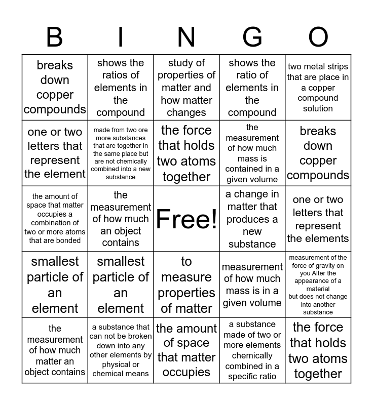 This bingo card has a free space and 24 words: smallest particle of an element, a substance that can not be broken down into any other elements by physical or chemical means, the force that holds two atoms together, the measurement of how much matter an object contains, two metal strips that are place in a copper compound solution, breaks down copper compounds, one or two letters that represent the element, shows the ratios of elements in the compound, a change in matter that produces a new substance, to measure properties of matter, the measurement of how much mass is contained in a given volume, the amount of space that matter occupies a combination of two or more atoms that are bonded, measurement of how much mass is in a given volume, measurement of the force of gravity on you Alter the appearance of a material but does not change into another substance, made from two ore more substances that are together in the same place but are not chemically combined into a new substance, a substance made of two or more elements chemically combined in a specific ratio, one or two letters that represent the elements, study of properties of matter and how matter changes, breaks down copper compounds, the measurement of how much an object contains, the force that holds two atoms together, smallest particle of an element, shows the ratio of elements in the compound and the amount of space that matter occupies.