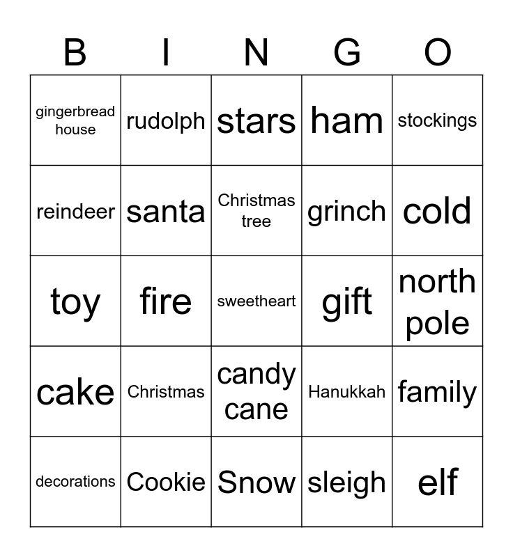 This bingo card has 25 words: Christmas, Snow, Christmas tree, decorations, stockings, gingerbread house, reindeer, rudolph, gift, candy cane, grinch, toy, Hanukkah, family, santa, elf, north pole, stars, cold, fire, sweetheart, Cookie, cake, ham and sleigh.