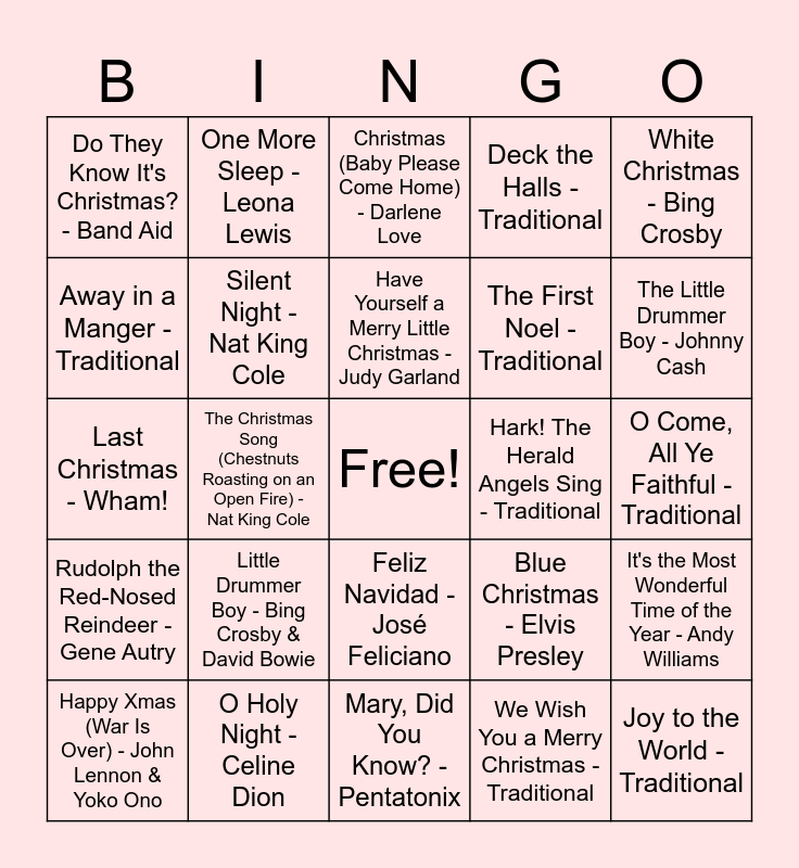 This bingo card has a free space and 40 words: All I Want for Christmas Is You - Mariah Carey, Last Christmas - Wham!, Jingle Bells - Bing Crosby & The Andrews Sisters, Silent Night - Nat King Cole, O Holy Night - Celine Dion, Feliz Navidad - José Feliciano, Have Yourself a Merry Little Christmas - Judy Garland, Santa Claus Is Coming to Town - Bruce Springsteen, White Christmas - Bing Crosby, Rudolph the Red-Nosed Reindeer - Gene Autry, The Christmas Song (Chestnuts Roasting on an Open Fire) - Nat King Cole, Deck the Halls - Traditional, Joy to the World - Traditional, O Come, All Ye Faithful - Traditional, Hark! The Herald Angels Sing - Traditional, Little Drummer Boy - Bing Crosby & David Bowie, Let It Snow! Let It Snow! Let It Snow! - Dean Martin, Do They Know It's Christmas? - Band Aid, Wonderful Christmastime - Paul McCartney, Christmas (Baby Please Come Home) - Darlene Love, It's the Most Wonderful Time of the Year - Andy Williams, We Wish You a Merry Christmas - Traditional, The First Noel - Traditional, Away in a Manger - Traditional, God Rest Ye Merry, Gentlemen - Traditional, O Little Town of Bethlehem - Traditional, Good King Wenceslas - Traditional, I Saw Three Ships - Traditional, Jingle Bell Rock - Bobby Helms, Santa Baby - Eartha Kitt, Merry Christmas Everyone - Shakin' Stevens, Happy Xmas (War Is Over) - John Lennon & Yoko Ono, Christmas Time Is Here - Vince Guaraldi, Blue Christmas - Elvis Presley, The Little Drummer Boy - Johnny Cash, Mary, Did You Know? - Pentatonix, Christmas Lights - Coldplay, Underneath the Tree - Kelly Clarkson, One More Sleep - Leona Lewis and Snowman - Sia.