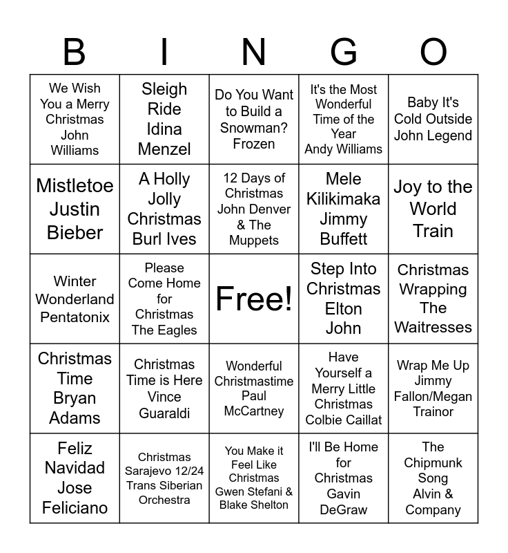 This bingo card has a free space and 24 words: Christmas Time is Here Vince Guaraldi, Christmas Sarajevo 12/24 Trans Siberian Orchestra, 12 Days of Christmas John Denver & The Muppets, Feliz Navidad Jose Feliciano, Baby It's Cold Outside John Legend, We Wish You a Merry Christmas John Williams, Mistletoe Justin Bieber, Sleigh Ride Idina Menzel, Step Into Christmas Elton John, Wonderful Christmastime Paul McCartney, Mele Kilikimaka Jimmy Buffett, Winter Wonderland Pentatonix, Have Yourself a Merry Little Christmas Colbie Caillat, Wrap Me Up Jimmy Fallon/Megan Trainor, A Holly Jolly Christmas Burl Ives, I'll Be Home for Christmas Gavin DeGraw, Christmas Wrapping The Waitresses, Do You Want to Build a Snowman? Frozen, Joy to the World Train, Please Come Home for Christmas The Eagles, The Chipmunk Song Alvin & Company, Christmas Time Bryan Adams, It's the Most Wonderful Time of the Year Andy Williams and You Make it Feel Like Christmas Gwen Stefani & Blake Shelton.
