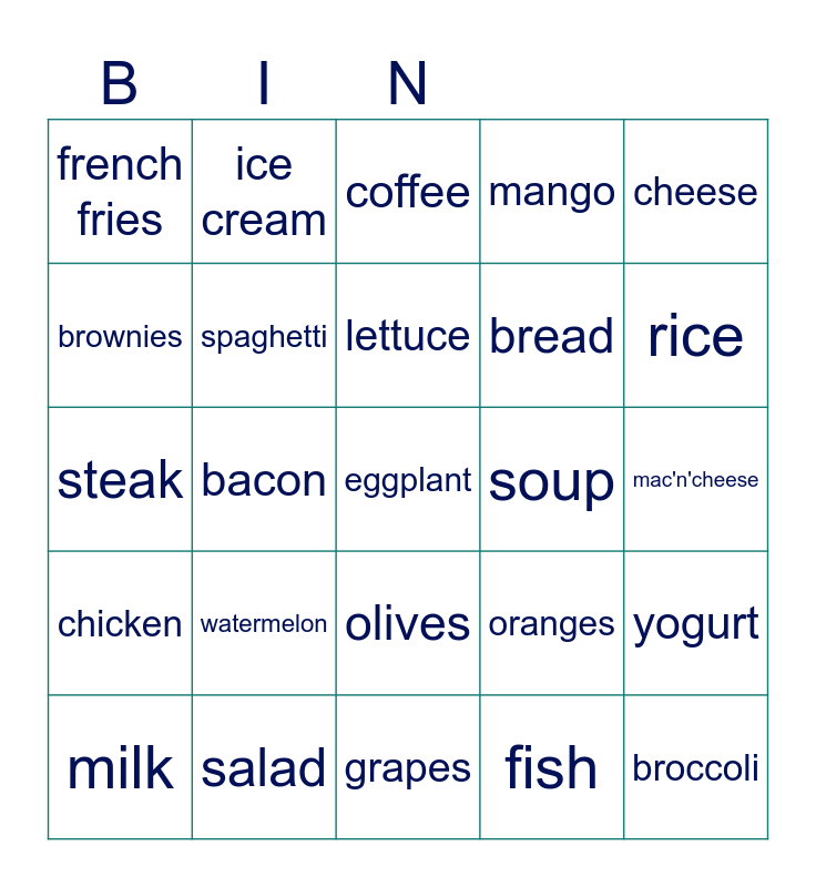 This bingo card has a free space and 34 words: hamburger, fish, pizza, eggs, chicken, spaghetti, cheese, milk, ice cream, cookies, lettuce, coffee, carrots, apple, soup, rice, salad, steak, watermelon, oranges, olives, pancakes, french fries, mac'n'cheese, grapes, broccoli, mango, sweet potato, bread, brownies, almonds, bacon, yogurt and cake.