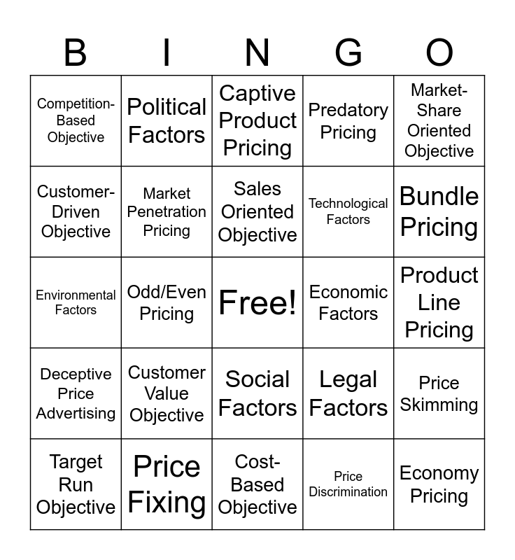 This bingo card has a free space and 25 words: Customer Value Objective, Cost-Based Objective, Sales Oriented Objective, Target Run Objective, Market-Share Oriented Objective, Competition-Based Objective, Customer-Driven Objective, Political Factors, Economic Factors, Social Factors, Technological Factors, Environmental Factors, Legal Factors, Price Skimming, Market Penetration Pricing, Break-Even Pricing, Product Line Pricing, Captive Product Pricing, Bundle Pricing, Odd/Even Pricing, Economy Pricing, Price Fixing, Deceptive Price Advertising, Predatory Pricing and Price Discrimination.
