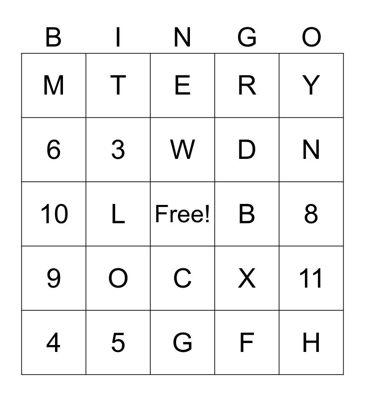 This bingo card has a free space and 29 words: 4, A, L, 1, M, E, 3, O, B, 5, 8, H, G, F, N, 7, C, 9, Y, 10, X, 2, D, 6, R, T, 11, W and 12.