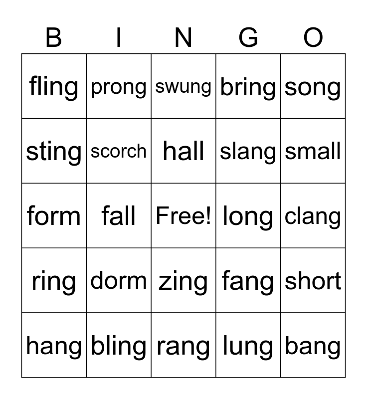 This bingo card has a free space and 54 words: sing, ring, wing, thing, zing, king, bring, sling, sting, cling, fling, swing, bling, hang, sang, rang, bang, slang, gang, clang, fang, pang, long, song, tong, prong, gong, ping-pong, sung, lung, stung, hung, slung, rung, swung, flung, form, short, porch, scorch, sport, storm, snort, stork, dorm, torch, wall, ball, hall, fall, small, stall, call and tall.