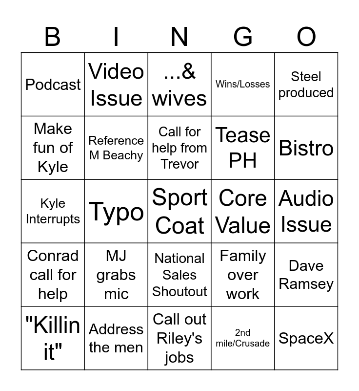 This bingo card has a free space and 24 words: MJ grabs mic, Address the men, Call for help from Trevor, "Killin it", Steel produced, Podcast, Make fun of Kyle, Video Issue, Core Value, National Sales Shoutout, Tease PH, Kyle Interrupts, Family over work, Dave Ramsey, Reference M Beachy, 2nd mile/Crusade, Audio Issue, ...& wives, Bistro, Typo, SpaceX, Conrad call for help, Wins/Losses and Call out Riley's jobs.