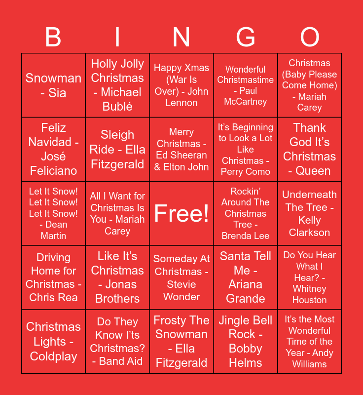 This bingo card has a free space and 31 words: Frosty The Snowman - Ella Fitzgerald, Last Christmas - Wham!, All I Want for Christmas Is You - Mariah Carey, Mistletoe - Justin Bieber, Snowman - Sia, Happy Xmas (War Is Over) - John Lennon, Sleigh Ride - Ella Fitzgerald, Santa Tell Me - Ariana Grande, Rockin’ Around The Christmas Tree - Brenda Lee, Jingle Bell Rock - Bobby Helms, Underneath The Tree - Kelly Clarkson, It’s the Most Wonderful Time of the Year - Andy Williams, Sleigh Ride - The Ronettes, My Only Wish (This Year) - Britney Spears, Thank God It’s Christmas - Queen, I’ll Be Home - Meghan Trainor, Do You Hear What I Hear? - Whitney Houston, Like It’s Christmas - Jonas Brothers, Driving Home for Christmas - Chris Rea, Someday At Christmas - Stevie Wonder, Christmas (Baby Please Come Home) - Mariah Carey, Lonely This Christmas - Mud, Christmas Lights - Coldplay, Holly Jolly Christmas - Michael Bublé, It’s Beginning to Look a Lot Like Christmas - Perry Como, Feliz Navidad - José Feliciano, Wonderful Christmastime - Paul McCartney, Let It Snow! Let It Snow! Let It Snow! - Dean Martin, Do They Know I’ts Christmas? - Band Aid, Merry Christmas - Ed Sheeran & Elton John and Have Yourself A Merry Little Christmas - Michael Bublé.