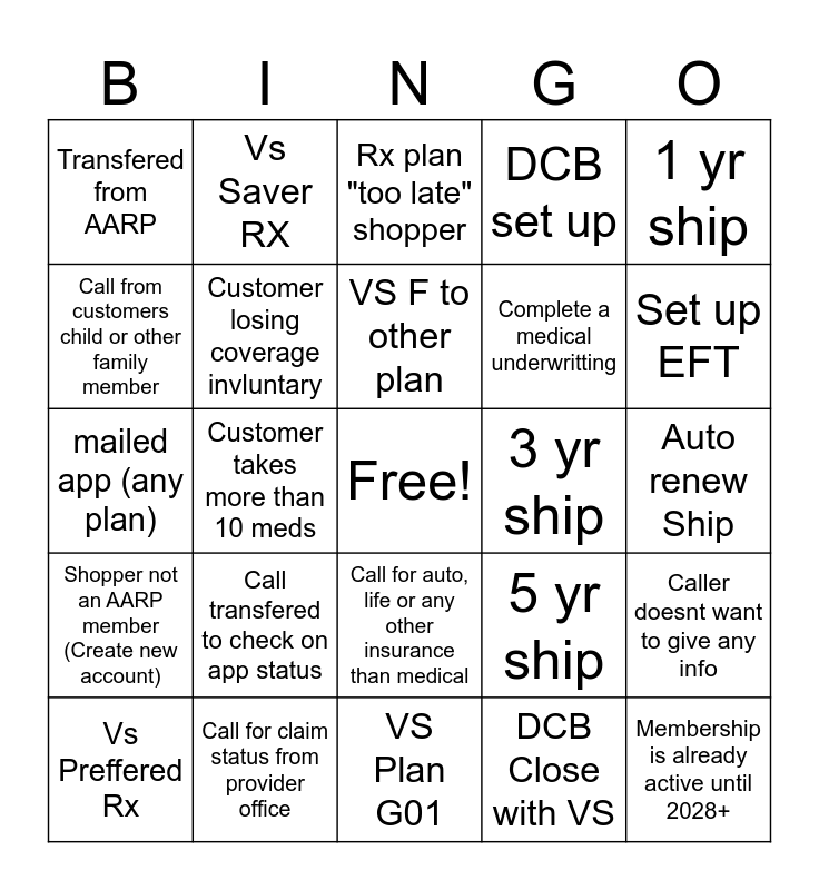 This bingo card has a free space and 25 words: Call transfered to check on app status, VS Plan G01, VS F to other plan, Vs Preffered Rx, 1 yr ship, Transfered from AARP, Call from customers child or other family member, Vs Saver RX, 3 yr ship, Call for auto, life or any other insurance than medical, Complete a medical underwritting, mailed app (any plan), 5 yr ship, Caller doesnt want to give any info, Customer losing coverage invluntary, FOE shopper, Auto renew Ship, Rx plan "too late" shopper, Set up EFT, Customer takes more than 10 meds, Membership is already active until 2028+, Call for claim status from provider office, Shopper not an AARP member (Create new account), DCB set up and DCB Close with VS.