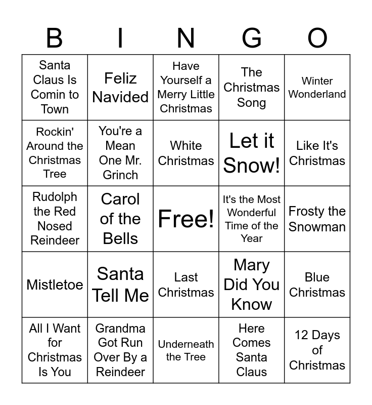 This bingo card has a free space and 24 words: Santa Tell Me, Grandma Got Run Over By a Reindeer, White Christmas, All I Want for Christmas Is You, Winter Wonderland, Santa Claus Is Comin to Town, Rockin' Around the Christmas Tree, Feliz Navided, It's the Most Wonderful Time of the Year, Last Christmas, Let it Snow!, Rudolph the Red Nosed Reindeer, Mary Did You Know, Blue Christmas, You're a Mean One Mr. Grinch, Here Comes Santa Claus, Frosty the Snowman, Have Yourself a Merry Little Christmas, Like It's Christmas, Carol of the Bells, 12 Days of Christmas, Mistletoe, The Christmas Song and Underneath the Tree.