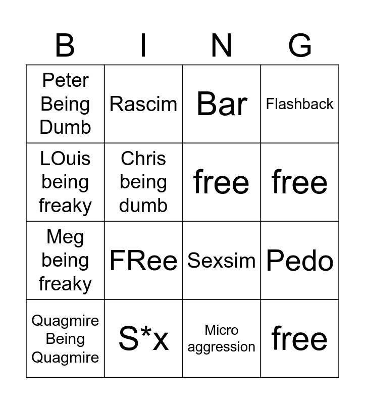 This bingo card has 16 words: S*x, Pedo, Bar, Peter Being Dumb, Meg being freaky, Rascim, Sexsim, Micro aggression, LOuis being freaky, Chris being dumb, Quagmire Being Quagmire, Flashback, FRee, free, free and free.
