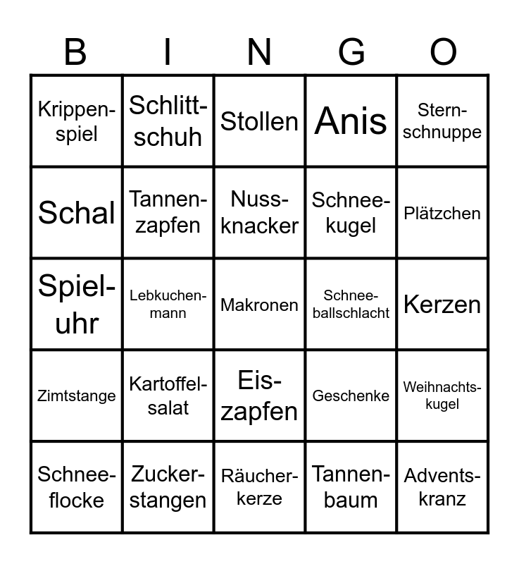 This bingo card has 25 words: Kartoffel- salat, Räucher-kerze, Nuss-knacker, Schnee-flocke, Stern-schnuppe, Krippen- spiel, Schal, Schlitt-schuh, Schnee-ballschlacht, Eis-zapfen, Schnee-kugel, Spiel-uhr, Geschenke, Weihnachts-kugel, Tannen-zapfen, Advents-kranz, Kerzen, Stollen, Plätzchen, Lebkuchen-mann, Makronen, Zucker-stangen, Zimtstange, Anis and Tannen-baum.