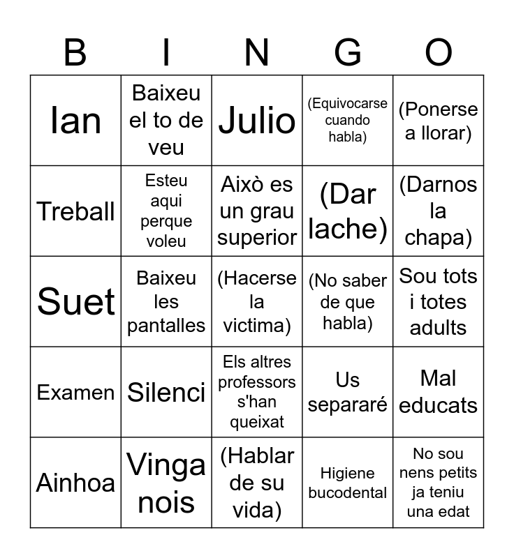 This bingo card has a free space and 24 words: Silenci, Vinga nois, Això es un grau superior, Ainhoa, (Ponerse a llorar), Ian, Treball, Baixeu el to de veu, (No saber de que habla), Els altres professors s'han queixat, (Dar lache), Suet, Us separaré, Mal educats, Esteu aqui perque voleu, Higiene bucodental, Sou tots i totes adults, Julio, (Darnos la chapa), Baixeu les pantalles, No sou nens petits ja teniu una edat, Examen, (Equivocarse cuando habla) and (Hablar de su vida).