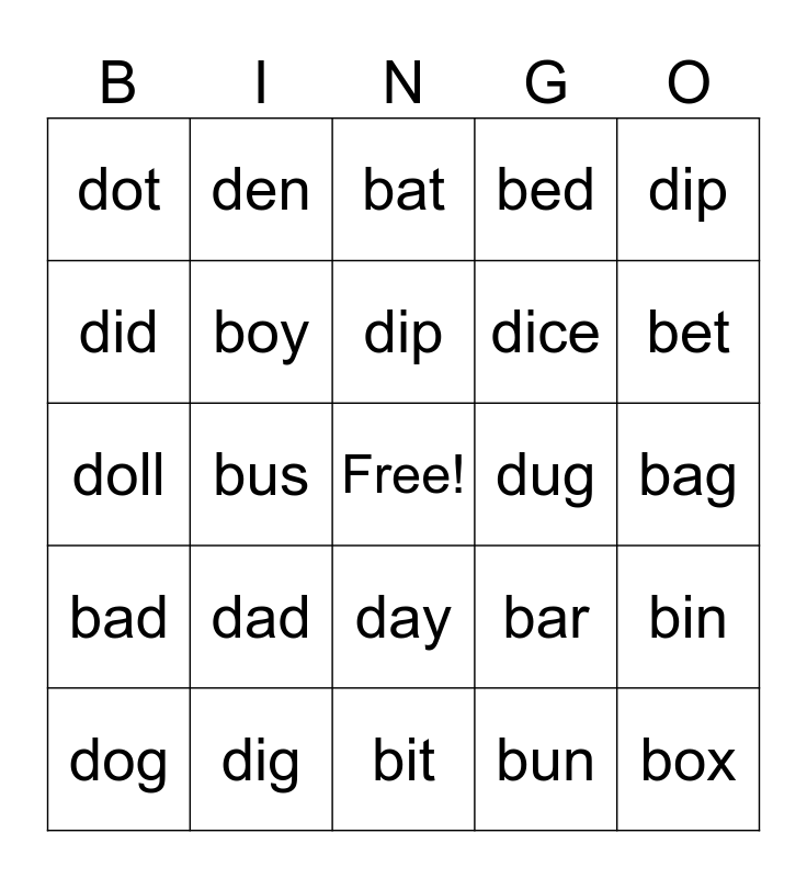 This bingo card has a free space and 24 words: dad, dig, dip, dog, dip, dot, did, den, dug, day, dice, doll, bar, bin, boy, bun, bag, bat, bet, bus, box, bad, bed and bit.