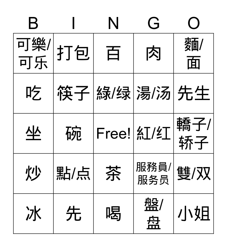 This bingo card has a free space and 24 words: 點/点, 先, 綠/绿, 冰, 麵/ 面, 可樂/可乐, 吃, 打包, 紅/红, 茶, 湯/汤, 坐, 服務員/服务员, 雙/双, 筷子, 盤/ 盘, 轎子/轿子, 百, 先生, 碗, 小姐, 炒, 肉 and 喝.