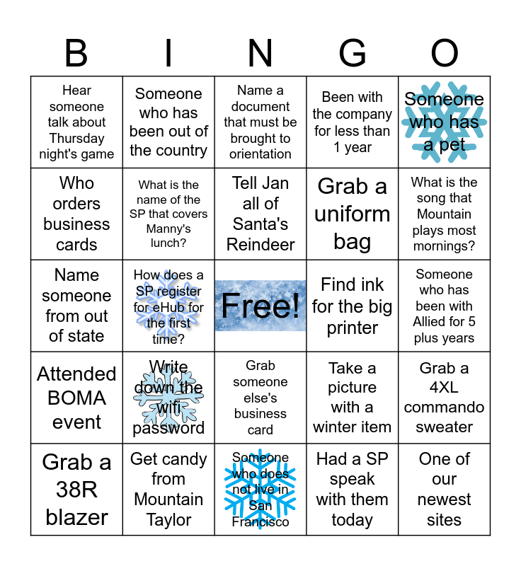 This bingo card has 4 images, a free space and 24 words: Write down the wifi password, Get candy from Mountain Taylor, Tell Jan all of Santa's Reindeer, Grab a 38R blazer, Someone who has a pet, Hear someone talk about Thursday night's game, Who orders business cards, Someone who has been out of the country, Find ink for the big printer, Grab someone else's business card, Grab a uniform bag, Name someone from out of state, Take a picture with a winter item, Grab a 4XL commando sweater, What is the name of the SP that covers Manny's lunch?, Had a SP speak with them today, Someone who has been with Allied for 5 plus years, Name a document that must be brought to orientation, What is the song that Mountain plays most mornings?, How does a SP register for eHub for the first time?, One of our newest sites, Attended BOMA event, Been with the company for less than 1 year and Someone who does not live in San Francisco.