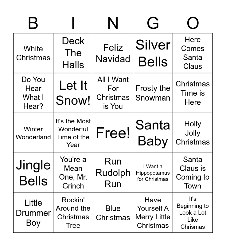This bingo card has a free space and 30 words: Rockin' Around the Christmas Tree, Jingle Bell Rock, It's the Most Wonderful Time of the Year, Sleigh Ride, White Christmas, Feliz Navidad, Let It Snow!, Run Rudolph Run, Santa Baby, Blue Christmas, Holly Jolly Christmas, It's Beginning to Look a Lot Like Chrismas, Have Yourself A Merry Little Christmas, Rudolph the Red-Nosed Reindeer, Christmas Time is Here, Little Saint Nick, I Want a Hippopotamus for Christmas, Jingle Bells, You're a Mean One, Mr. Grinch, Here Comes Santa Claus, Winter Wonderland, This Christmas, Deck The Halls, Frosty the Snowman, Do You Hear What I Hear?, Silver Bells, Santa Claus is Coming to Town, Little Drummer Boy, All I Want For Christmas is You and Last Christmas.