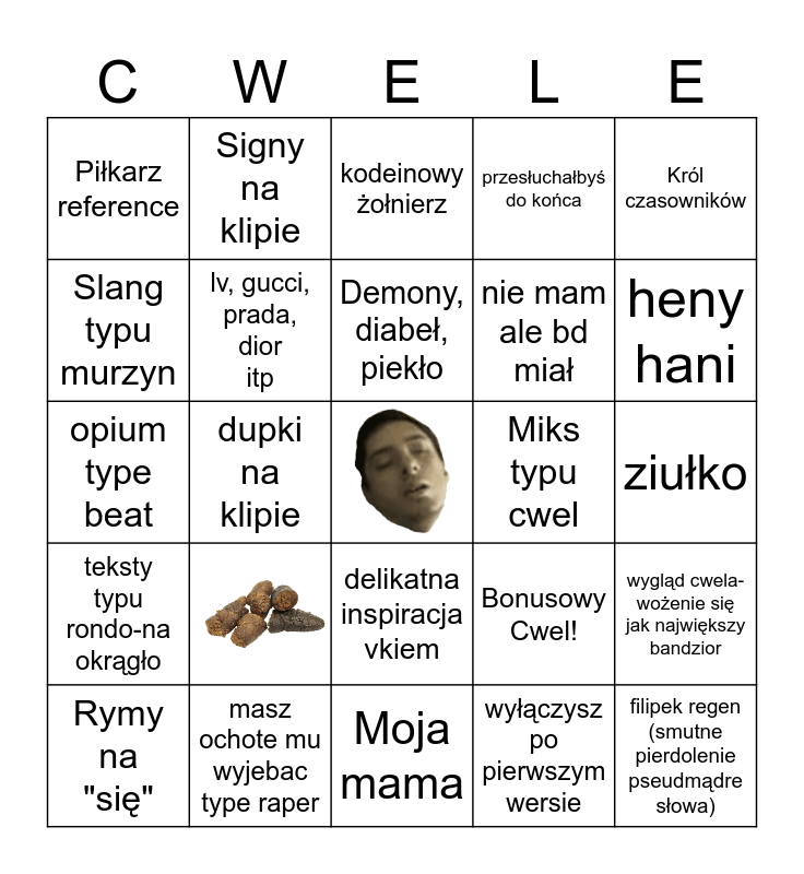 This bingo card has 2 images and 23 words: Moja mama, Demony, diabeł, piekło, Rymy na "się", Król czasowników, Piłkarz reference, Slang typu murzyn, Signy na klipie, Miks typu cwel, delikatna inspiracja vkiem, nie mam ale bd miał, opium type beat, Bonusowy Cwel!, wygląd cwela-wożenie się jak największy bandzior, lv, gucci, prada, dior itp, filipek regen (smutne pierdolenie pseudmądre słowa), ziułko, kodeinowy żołnierz, heny hani, dupki na klipie, masz ochote mu wyjebac type raper, teksty typu rondo-na okrągło, przesłuchałbyś do końca and wyłączysz po pierwszym wersie.