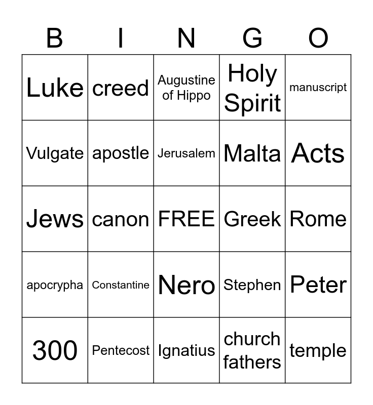 This bingo card has a free space and 24 words: Constantine, Pentecost, Jerusalem, 300, manuscript, Luke, Vulgate, creed, Greek, Nero, Malta, Jews, Stephen, Peter, apostle, church fathers, Rome, Augustine of Hippo, Acts, canon, temple, apocrypha, Holy Spirit and Ignatius.