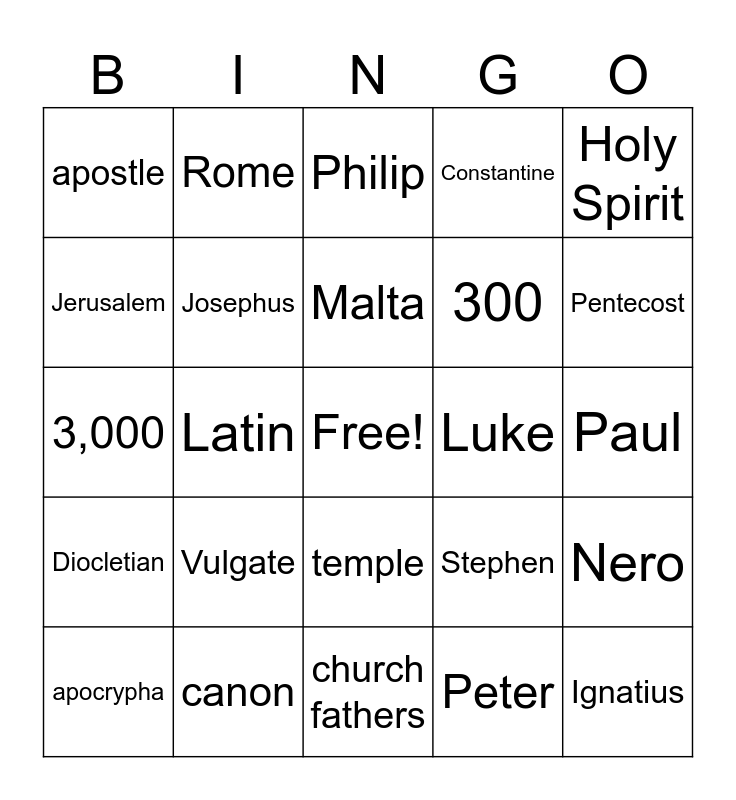 This bingo card has a free space and 24 words: Vulgate, canon, Malta, apocrypha, Holy Spirit, apostle, Jerusalem, Rome, Luke, temple, 300, 3,000, Stephen, Nero, Josephus, Peter, Paul, Philip, Pentecost, Latin, Ignatius, Diocletian, Constantine and church fathers.