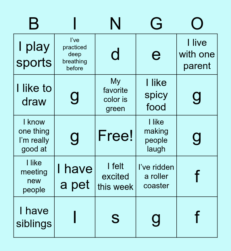This bingo card has a free space and 24 words: I have a pet, I, My favorite color is green, I have siblings, I live with one parent, I play sports, I like to draw, I’ve practiced deep breathing before, I like making people laugh, I felt excited this week, I like spicy food, I know one thing I’m really good at, I’ve ridden a roller coaster, f, g, g, g, d, g, g, f, I like meeting new people, e and s.