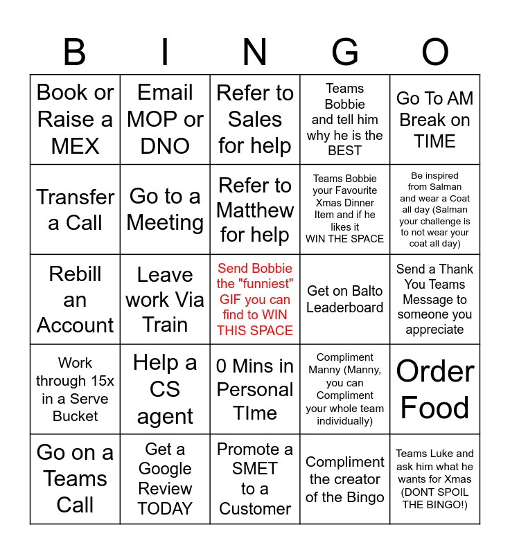 This bingo card has a free space and 34 words: Take 5x Inbound Calls, Compliment the creator of the Bingo, in Metering and Billing GC, Start a petition for more department games, High Five Josh (Josh, you can attempt to High Five KAH), Work through 15x in a Serve Bucket, Go to a Meeting, Go To AM Break on TIME, Go on a Teams Call, Email MOP or DNO, Drink Tea or Coffee (from staff kitchen), Refer to Matthew for help, Refer to Sales for help, 2x Outbound Calls, Go for a Smoke/Vape break, Get on Balto Leaderboard, Be inspired from Salman and wear a Coat all day (Salman your challenge is to not wear your coat all day), Get a Google Review TODAY, Rebill an Account, Help a CS agent, Compliment Manny (Manny, you can Compliment your whole team individually), 0 Mins in Personal TIme, Go to Lunch bang on Time, Book or Raise a MEX, Send a Thank You Teams Message to someone you appreciate, Promote a SMET to a Customer, Teams Luke and ask him what he wants for Xmas (DONT SPOIL THE BINGO!), Teams Bobbie and tell him why he is the BEST, Compliment Adam M, Teams Bobbie your Favourite Xmas Dinner Item and if he likes it WIN THE SPACE, Transfer a Call, Go to PM Break on Time, Leave work Via Train, Order Food and Buy and ENJOY a Dr Pepper and Ready Salted Hula Hoops.