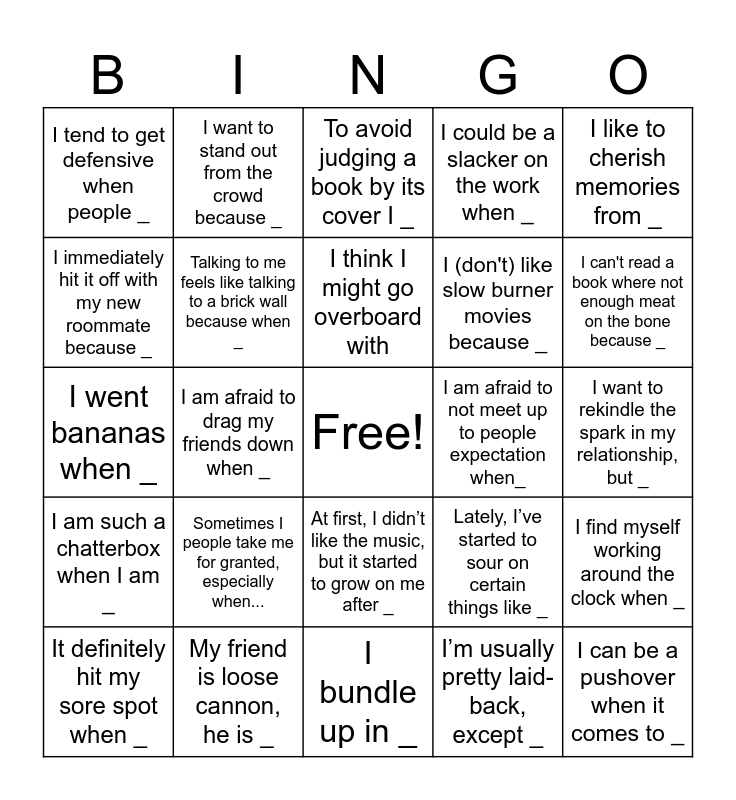 This bingo card has a free space and 24 words: Sometimes I people take me for granted, especially when..., My friend is loose cannon, he is _, I think I might go overboard with, It definitely hit my sore spot when _, I like to cherish memories from _, I tend to get defensive when people _, I immediately hit it off with my new roommate because _, I want to stand out from the crowd because _, I am afraid to not meet up to people expectation when_, At first, I didn’t like the music, but it started to grow on me after _, I (don't) like slow burner movies because _, I went bananas when _, Lately, I’ve started to sour on certain things like _, I find myself working around the clock when _, Talking to me feels like talking to a brick wall because when _, I’m usually pretty laid-back, except _, I want to rekindle the spark in my relationship, but _, To avoid judging a book by its cover I _, I can't read a book where not enough meat on the bone because _, I am afraid to drag my friends down when _, I can be a pushover when it comes to _, I am such a chatterbox when I am _, I could be a slacker on the work when _ and I bundle up in _.