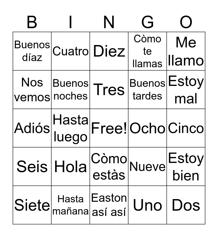 This bingo card has a free space and 24 words: Hola, Hasta mañana, Tres, Siete, Me llamo, Buenos díaz, Nos vemos, Cuatro, Ocho, Còmo estàs, Buenos tardes, Adiós, Nueve, Estoy bien, Buenos noches, Uno, Cinco, Diez, Estoy mal, Hasta luego, Dos, Seis, Còmo te llamas and Easton así así.