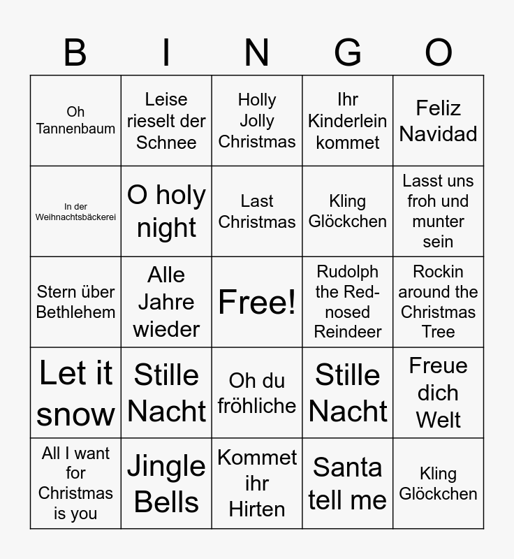This bingo card has a free space and 24 words: Stille Nacht, Jingle Bells, Last Christmas, All I want for Christmas is you, Feliz Navidad, Oh Tannenbaum, In der Weihnachtsbäckerei, Leise rieselt der Schnee, Rudolph the Red-nosed Reindeer, Oh du fröhliche, Kling Glöckchen, Stern über Bethlehem, Stille Nacht, Freue dich Welt, O holy night, Santa tell me, Rockin around the Christmas Tree, Holly Jolly Christmas, Lasst uns froh und munter sein, Alle Jahre wieder, Kling Glöckchen, Let it snow, Ihr Kinderlein kommet and Kommet ihr Hirten.