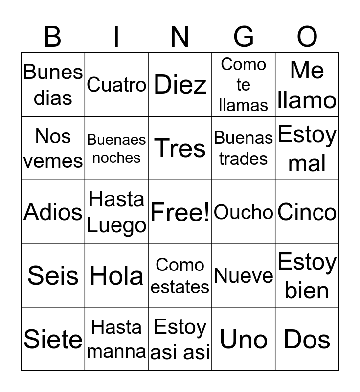 This bingo card has a free space and 24 words: Hola, Hasta manna, Tres, Siete, Me llamo, Bunes dias, Nos vemes, Cuatro, Oucho, Como estates, Buenas trades, Adios, Nueve, Estoy bien, Buenaes noches, Uno, Cinco, Diez, Estoy mal, Hasta Luego, Dos, Seis, Como te llamas and Estoy asi asi.