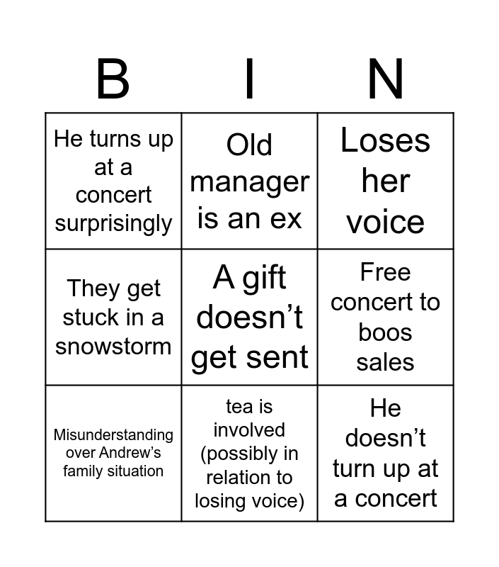This bingo card has a free space and 8 words: Free concert to boos sales, Loses her voice, Old manager is an ex, Misunderstanding over Andrew’s family situation, He turns up at a concert surprisingly, He doesn’t turn up at a concert, They get stuck in a snowstorm and tea is involved (possibly in relation to losing voice).