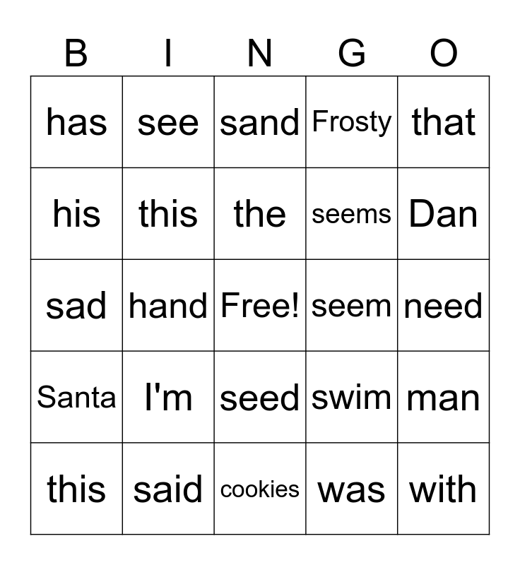 This bingo card has a free space and 24 words: I'm, said, the, this, that, has, his, see, seem, seed, seems, sad, swim, man, this, was, need, sand, Dan, hand, with, Santa, Frosty and cookies.