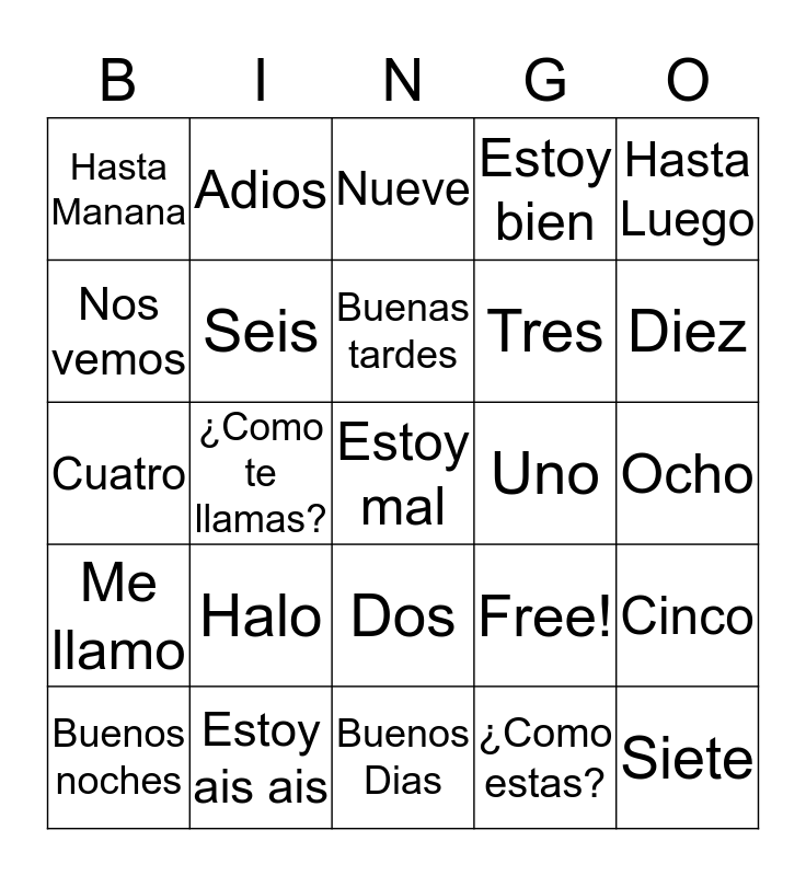 This bingo card has 25 words: Halo, Buenos Dias, Buenas tardes, Buenos noches, Hasta Luego, Hasta Manana, Nos vemos, Adios, Uno, Dos, Tres, Cuatro, Free!, Cinco, Seis, Siete, Ocho, Nueve, Diez, ¿Como te llamas?, Estoy mal, Estoy ais ais, Me llamo, Estoy bien and ¿Como estas?.